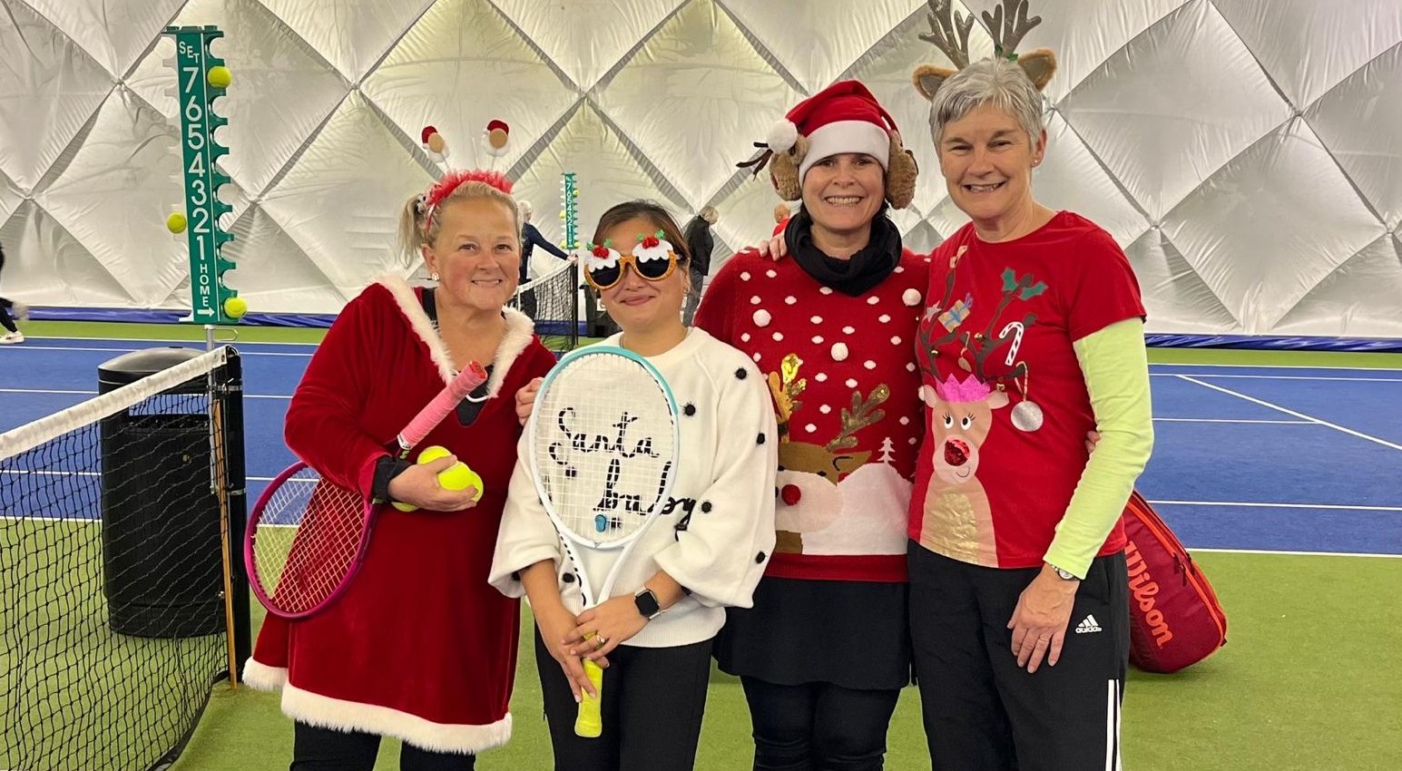 Sixteen players entered our fun tennis event in the dome at our Xmas Celebration Night on 6th December, with festive dress and music to boot. Coach Danny created a fun format with four players in each of four aptly named groups, …The Bauble Babes, The Crackers, The Comets and the Naughty Elves.